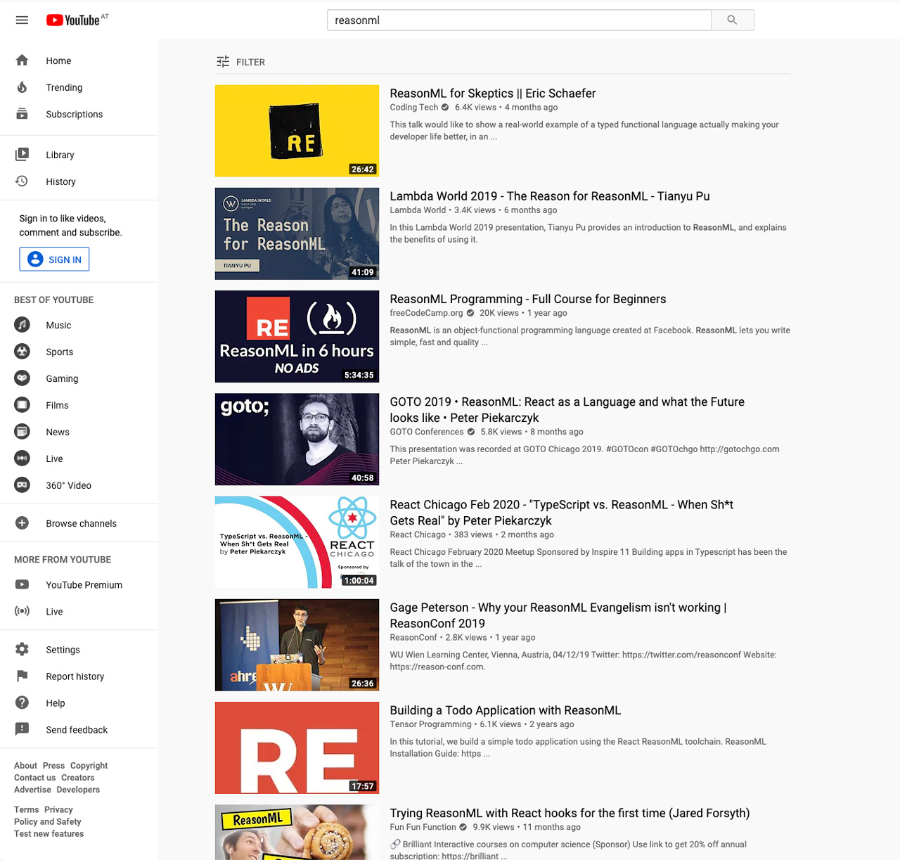 Top hits on Youtube for 'reasonml' (not logged in, anonymous browser session)